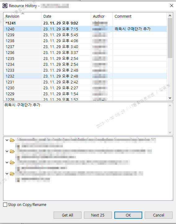 6. Select 버튼을 누르면 Resource History 팝업이 나오며, Commit된 소스들의 History가 나온다