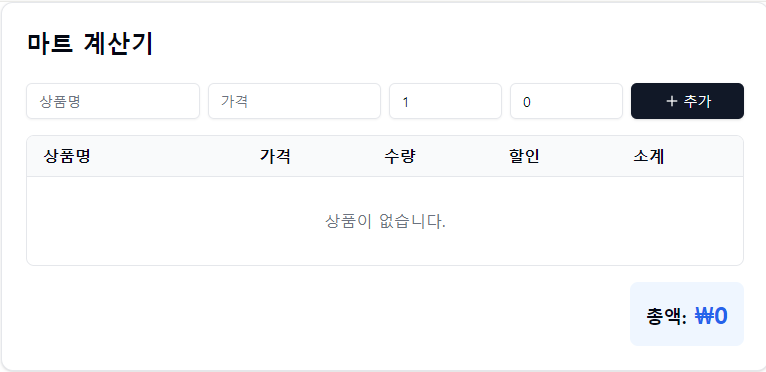 안녕하세요! 오늘은 React와 Tailwind CSS를 사용하여 실용적인 마트 계산기를 만드는 방법을 알아보겠습니다. 이 프로젝트를 통해 실제 상황에서 사용할 수 있는 계산기를 구현하면서 React의 상태 관리와 UI 구성 방법을 배워볼 수 있습니다.주요 기능상품 정보 입력 (상품명, 가격, 수량, 할인율)상품 목록 관리 (추가/삭제)할인율 적용 및 계산총액 자동 계산한국 원화 형식으로 금액 표시사용된 기술React.jsTailwind CSSshadcn/ui (Card, Button, Input 컴포넌트)Lucide React (아이콘)기능 구현1. 상태 관리 설정먼저 필요한 상태들을 정의합니다:const [items, setItems] = useState([]); // 상품 목록const [curre..